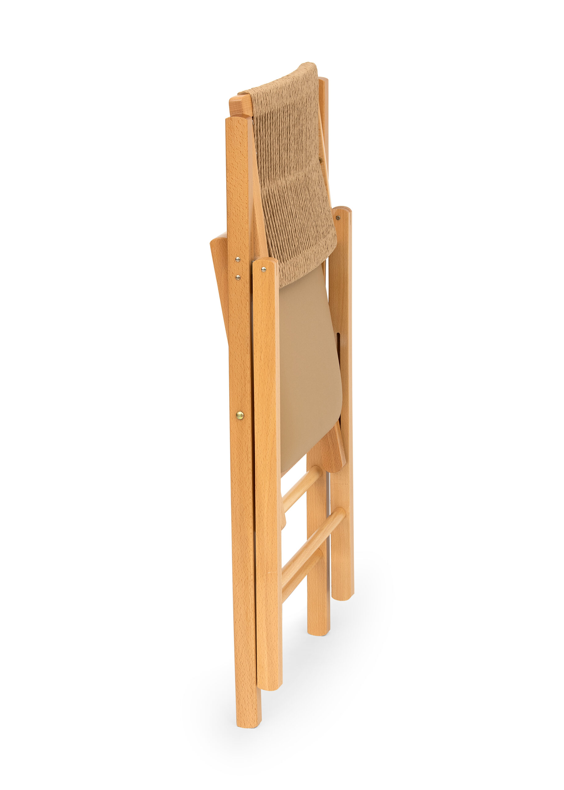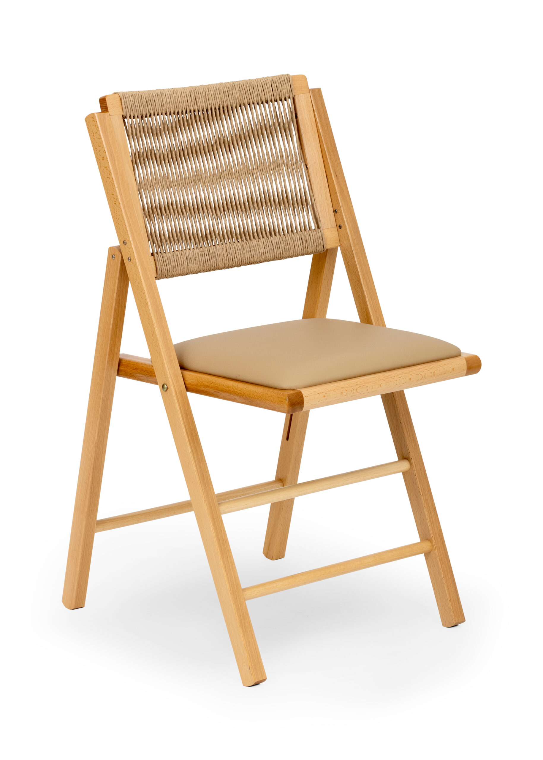 A versatile and modern folding chair that will give any room a fresh new look. It has a beech wood frame, a hand-woven rope backrest and a faux leather seat. Other fabrics are available on request.